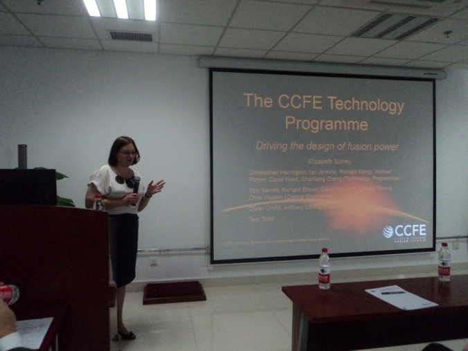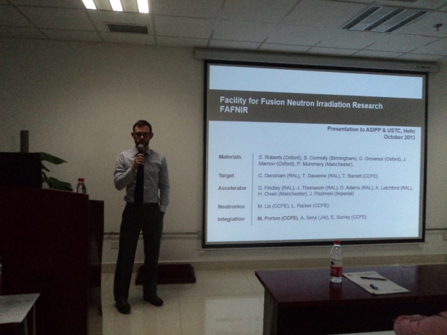CCFE技术项目主管E. Surrey博士以“Overview of Fusion Technology Programme”为题,介绍了CCFE的聚变科学研究情况,并同在场师生进行了密切的交流;S. Zheng(郑善良)博士详细介绍了关于聚变示范堆(DEMO)的氚自持系统的相关研究;M. Porto博士则以“Facility for Fusion Neutron Irradiation Research”为题,介绍了欧洲聚变中子辐照装置的设计原理、运行情况和未来计划等。