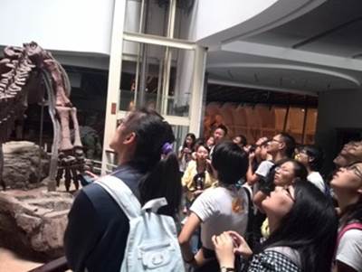 在昆明动物研究所的动物博物馆内参观恐龙化石标本