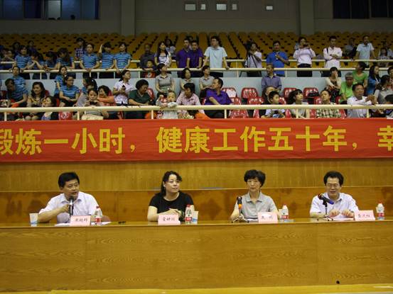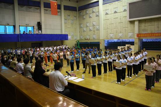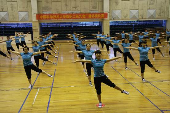 为贯彻落实《全民健身条例》,深入开展全民健身运动,推进校园精神文明建设和校园体育文化活动的深入开展,6月9日下午,由校工会和体育教学部联合主办的中国科大教职工第九套广播体操比赛在校南区体育馆举行。校党委副书记鹿明和中科院工会常务副主席、中科院体协秘书长霍妍丽出席入场式并致辞,校工会主席龚流柱及有关单位领导观看了比赛,比赛入场式由校工会常务副主席黄超群主持。