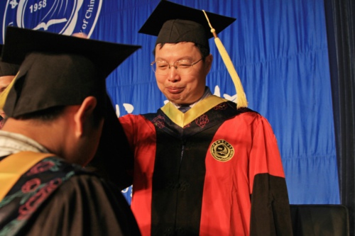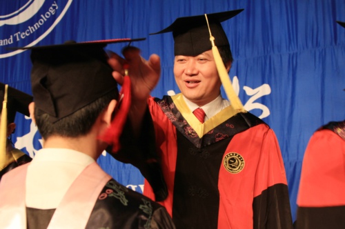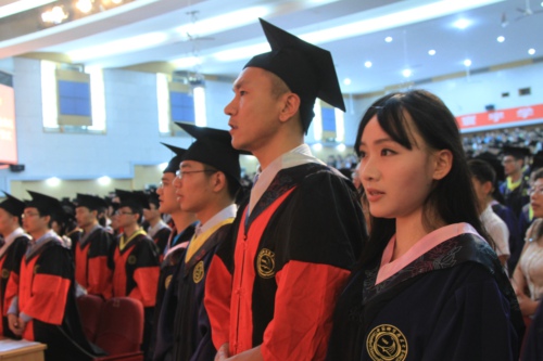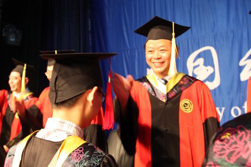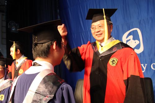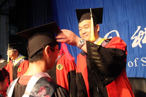 最后,在校歌的乐曲声中,同学们身着学位服依次走上主席台,校领导和导师代表们为他们一一扶正流苏。