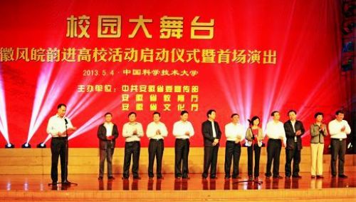 5月4日晚,校园大舞台徽风皖韵进高校活动启动仪式暨首场演出在我校东区大礼堂举行。省政府副省长谢广祥,省政府副秘书长吴行,省委教育工委书记、省教育厅厅长程艺,省委宣传部副部长郎涛,省文化厅厅长袁华,省委教育工委副书记江春,省文化厅副厅长唐跃,安徽演艺集团党委书记、董事长、总经理张居淮,光明日报驻安徽记者站站长李陈续,我校党委副书记鹿明,合肥工业大学党委副书记、纪委书记周军,安徽大学党委副书记李仁群等参加了启动仪式,并与我校近千名师生一起观看了演出。