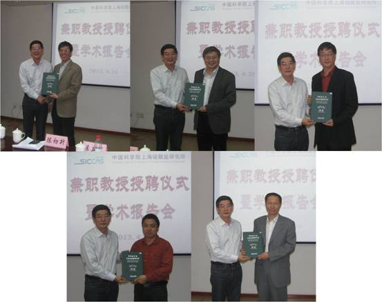 4月26日下午,中国科学院上海硅酸盐研究所兼职教授授聘仪式在定西园区4号楼14楼第二会议室举行,中国科学技术大学陈初升教授、朱长飞教授、陆亚林教授、陈春华教授、夏长荣教授受聘为中科院上海硅酸盐研究所兼职教授。授聘仪式由上海硅酸盐研究所副所长刘岩主持,上海硅酸盐研究所党委书记王龙根、副所长杨建华,科技发展部、人力资源处、研究生部负责人,以及中科院能量转换材料重点实验室部分师生出席聘任仪式。