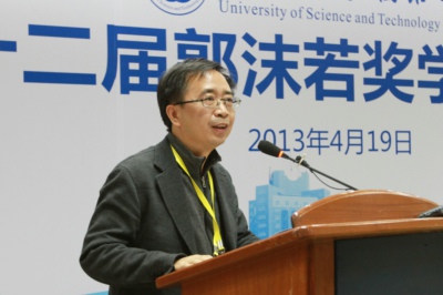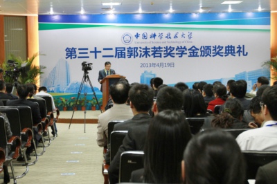 颁奖典礼上,侯建国校长发表讲话。他说,郭沫若奖学金是科大学子的最高荣誉,已经成为科大精神和文化不可分割的一部分。他代表学校向各位获奖同学表示衷心祝贺,向应邀参加典礼的各位家长、中学校长、老师和同学,以及专程回母校出席典礼的新创基金会的校友,表示热烈欢迎和衷心感谢,对各位父母、各位中学校长和老师、各位科大教师们为中国科大推荐和培养了最优秀的中学生表示敬意。