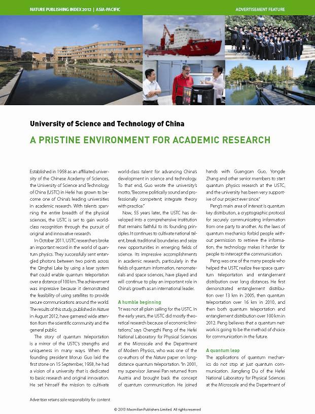 《2012年亚太地区自然出版指数》还以“A pristine environment for academic research”(一个纯净的学术研究环境)为题,对我校的量子信息、纳米材料和空间科学领域科研工作进行了深入报道。