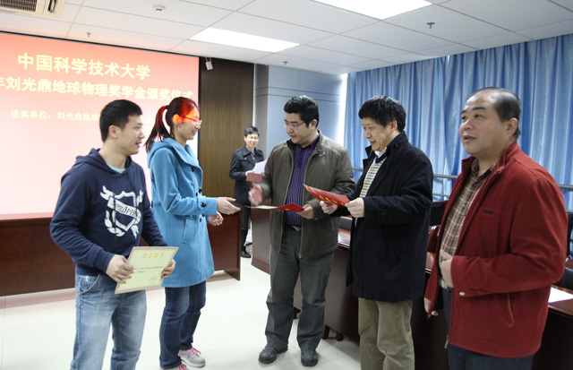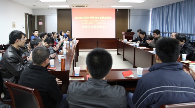 3月14日下午,地球和空间科学学院2012年度专项奖助学金颁奖仪式暨座谈会在教学行政楼702会议室举行。校党委学生工作部部长、学生工作处处长董雨、学院党总支书记刘斌、副院长黄建华为获得2012年度地学攀登奖学金、赵九章奖学金、劳雷奖学金、刘光鼎奖学金、817校友奖助学金的同学颁奖,会议由学院学生工作负责人吕冰涛主持。