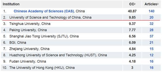 在这份最新的排名中,中国科学院在亚太地区科研机构排名中跃居第一,中国科大跃升至亚太区第8位,清华大学、北京大学、上海交大、深圳华大基因分列亚太区第9、12、15、17名。在中国高校中,中国科学技术大学自2012年度跃升榜首后,再次名列第一,清华大学、北京大学、上海交大、浙江大学(亚太区第23)、华中科大(亚太区第26)、复旦大学(亚太区第27)、香港大学(亚太区第41)、南京大学(亚太区第42)、厦门大学(亚太区第48)分列第2-10名。