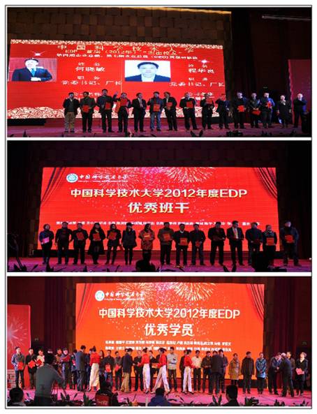 1月6日,中国科大2012届EMBA毕业典礼暨EMBA、EDP2013新年酒会在世纪金源大饭店举行。中国科学技术大学副校长张淑林、原安徽省政协副主席方兆本、安徽省商务厅副厅长张光建、安徽省经济和信息化工作委员会副巡视员陈家宝、中国科大管理学院执行院长梁樑等出席典礼,并与现场500多名学院师生同嘉宾一起见证了毕业典礼激动人心的时刻。毕业典礼后,举行了EMBA、EDP2013新年酒会。