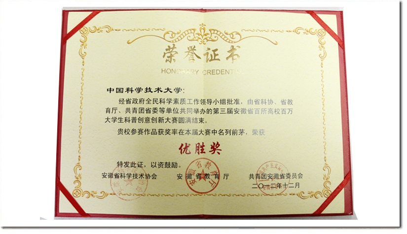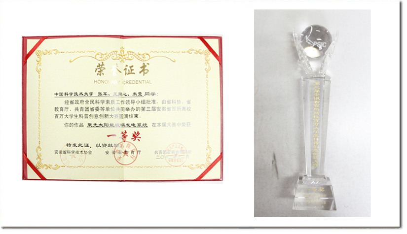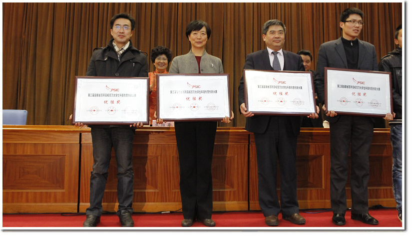 第三届“百所高校百万大学生科普创意创新大赛”自2012年5月正式启动,我校共提交作品69件。其中张军等同学的《聚光太阳能玻璃发电系统》作品获大赛一等奖,我校凭借优秀的参赛成绩,荣获优胜奖(共计5名)与优秀组织奖。鹿明老师上台领取了优胜奖奖牌。