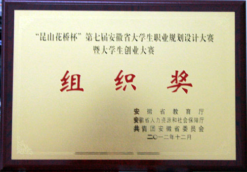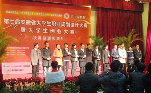 第七届“昆山花桥杯”安徽省大学生职业规划设计大赛暨大学生创业大赛是由省教育厅、省人力资源和社会保障厅、共青团安徽省委联合主办,江苏昆山花桥国际商务城冠名承办。本次大赛全省共有94所院校10万多名大学生参赛, 127支创业团队和153名职业规划参赛选手进入半决赛,30支团队和30名选手进入决赛,最终各评选出金奖10个,银奖20个。