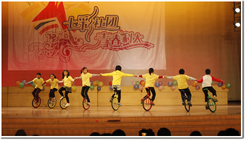 科大附中独轮车队使用了时下在孩子们中间特别流行的独轮车作为载体,带来了一段独轮车表演《追风少年》。孩子们熟练的操纵着独轮车在舞台上表演着各种颇具难度的动作并变换着队形,让大家在为他们捏一把汗的同时也不禁纷纷鼓掌叫好。