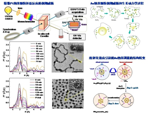 以上研究工作极大地丰富了人们在金属纳米颗粒和纳米团簇成核、生长以及微观结构、性能转变方面的动力学机理的认识,提供了操控纳米颗粒和团簇初期成核过程直至控制它们形貌合成的新思路,为最终调控纳米材料体系的合成、结构和性能提供了有益的借鉴。这一系列研究成果表明,以国家同步辐射实验室为主体发展的同步辐射新方法在纳米材料的调控研究领域获得了突破,具有广泛的国际影响力。