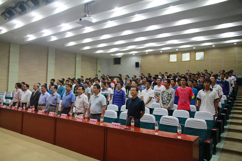欧阳钟灿院士首先讲话,他首先代表物理学院欢迎2012级各位同学加入到被称为“国内最牛大学学院”的中国科大物理学院,他回顾了物理学院所取得的骄人成绩,深信只要同学们珍惜在成就辉煌、名师不断的物理学院认真学习,一定会成长为令国家、老师、家长感到骄傲的物理学家。他提醒同学们我国的科学技术水平仍然与世界发达国家相距甚远,中国科技的崛起在于新一代的努力,希望同学们好好学习,早日实现我国在世界科技大奖方面零的突破。