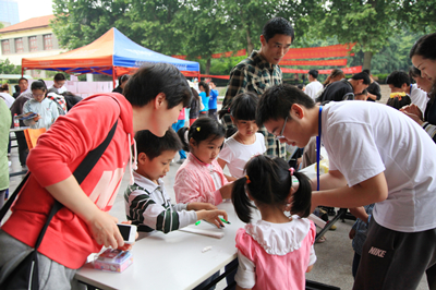 在化学与材料科学学院科普点,安排了趣味化学实验让大家体验化学的神奇魅力,还开放了化学教学实验室供大家参观。在志愿者的指导下,大家可以参与各种有趣的小实验:制作各色诱人的琼脂果冻,用手指头点燃酒精灯,制作漂亮的叶脉书签等。更吸引人的是,参加完趣味小实验还能收集印章,兑换小纪念品呢!小纪念品有漂亮的校园风景明信片、书签、笔、卡套等,参加完所有的实验活动,收集到15个印章的话,还能现场亲手制作一个珍贵的琥珀。此外,该科普点还在楼前的展板上图文并茂地展示了雾霾问题的成因、对策等,让人学到知识的同时,还能感受到化学在日常生活中的应用。
