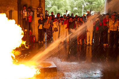 火灾科学国家重点实验室每年都是参观人数最集中的地方,试验厅里里外外到处都挤满了人。最吸引眼球的,莫过于水炮自动定位灭火实验和火旋风大型试验。演示时刻一到,现场顿时一片寂静,操作人员首先为大家演示火旋风试验。试验塔里的火苗开始燃烧,之后呈螺旋状迅速升腾,火越烧越旺,旋转愈加明显,直到燃料耗尽。在水炮灭火的演示中,工作人员将地上的火盆点燃,熊熊烈焰顿时腾起,安装在大厅墙壁上的感应器开始探测,迅速锁定着火点,水炮立即喷出一道弧形的水柱,将火盆浇灭。此外,火灾科学国家重点实验室还展示了大空间火灾试验厅场景、大型燃烧风洞场景、五层模型楼场景、火灾场景模拟等平台,推出了大型科技展板、火灾警示宣传科教片和互动游戏,以丰富多彩的形式向公众普及有关火灾安全知识。