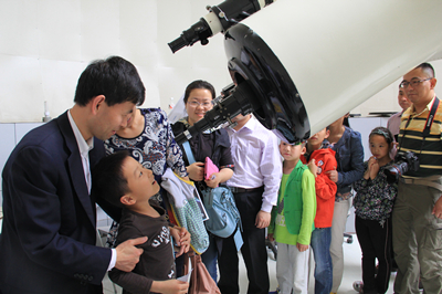 中科院星系宇宙学重点实验室每年都会吸引大量的参观者。现场安排了天文科普走廊展板、古天文仪器展示、模拟天文馆、播放天文科普电影等。据介绍,由于今天天空中云层太厚,通过顶楼的天文望远镜可能什么都看不到,但是参观者们还是要争相体验。这个观测点会一直开放到晚上9点,因为天气不错的话,晚上的观测效果会很好。