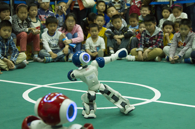 在信息科学技术科普点,参观者排成长龙。巨大的银幕上正在播放机器人比赛盛况。NAO机器人与家政服务机器人轮番展示才艺:打太极拳,跳起街舞,做家务,等等,娴熟的动作引得现场的小朋友不时发出欢呼声和惊叹声。