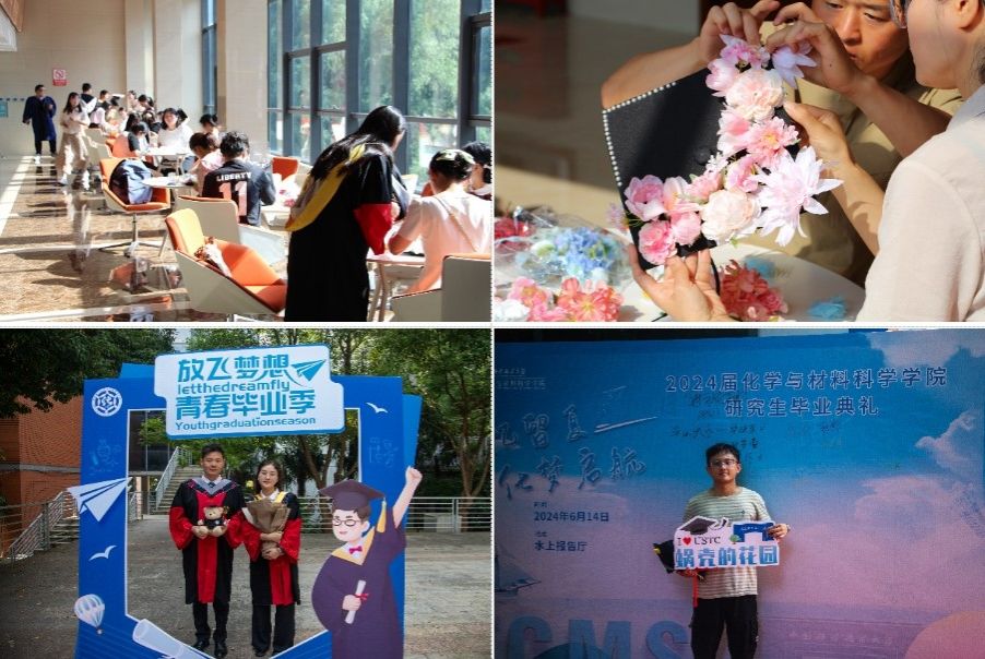 典礼开始前,毕业生们穿着学位服,在签名墙上签名合影,进行簪花活动,为自己的研究生生涯画上完美的句号。
