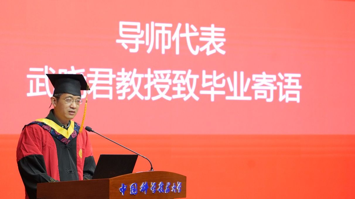 武晓君教授作为导师代表发言,回忆了自己曾经在科大的求学经历,感同身受的勉励各位毕业生,要跟着自己的节奏前行。他叮嘱同学们珍惜在科大的美好时光,仔细体会科研学术生活中的成功与失败,成长为具有独立思考能力和专业素养的人。