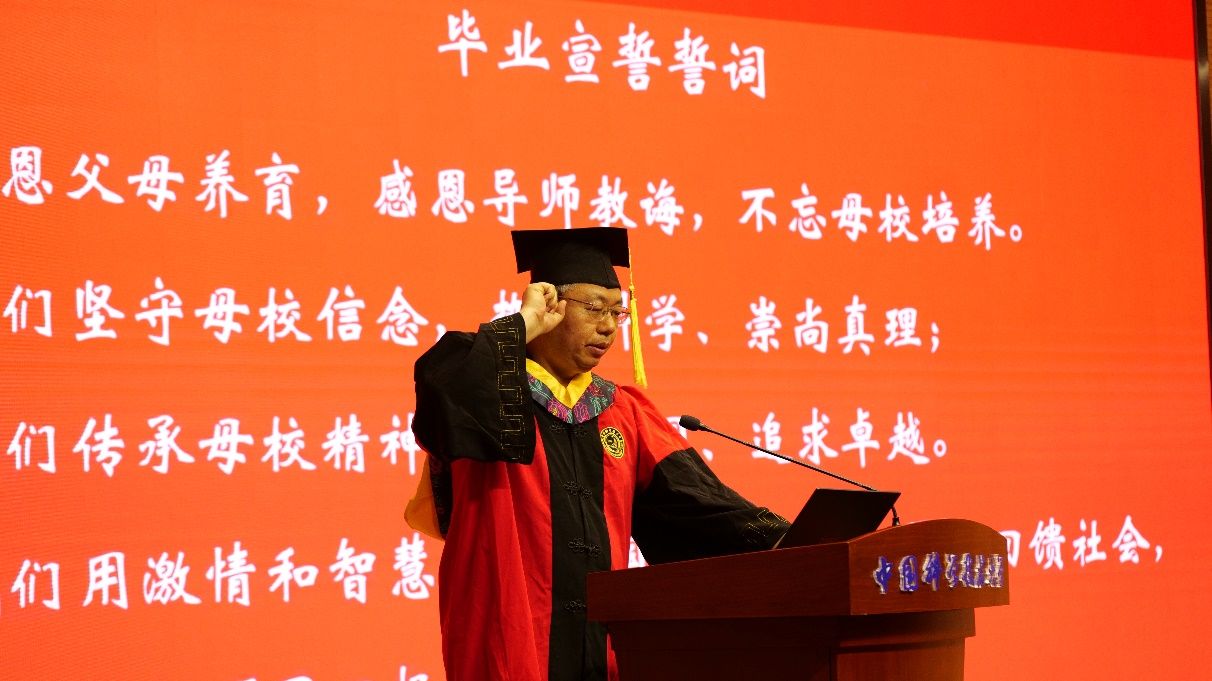全体毕业生在学院党委书记闫立峰教授的带领下庄严宣誓:“感恩父母养育,感恩导师教诲,不忘母校培养。我们坚守,母校信念,热爱科学、崇尚真理;我们传承母校精神,科教报国、追求卓越。我们用激情和智慧建设祖国,用责任和行动回馈社会,用成就和硕果回报母校。”宣誓结束后,全体毕业生齐唱校歌。