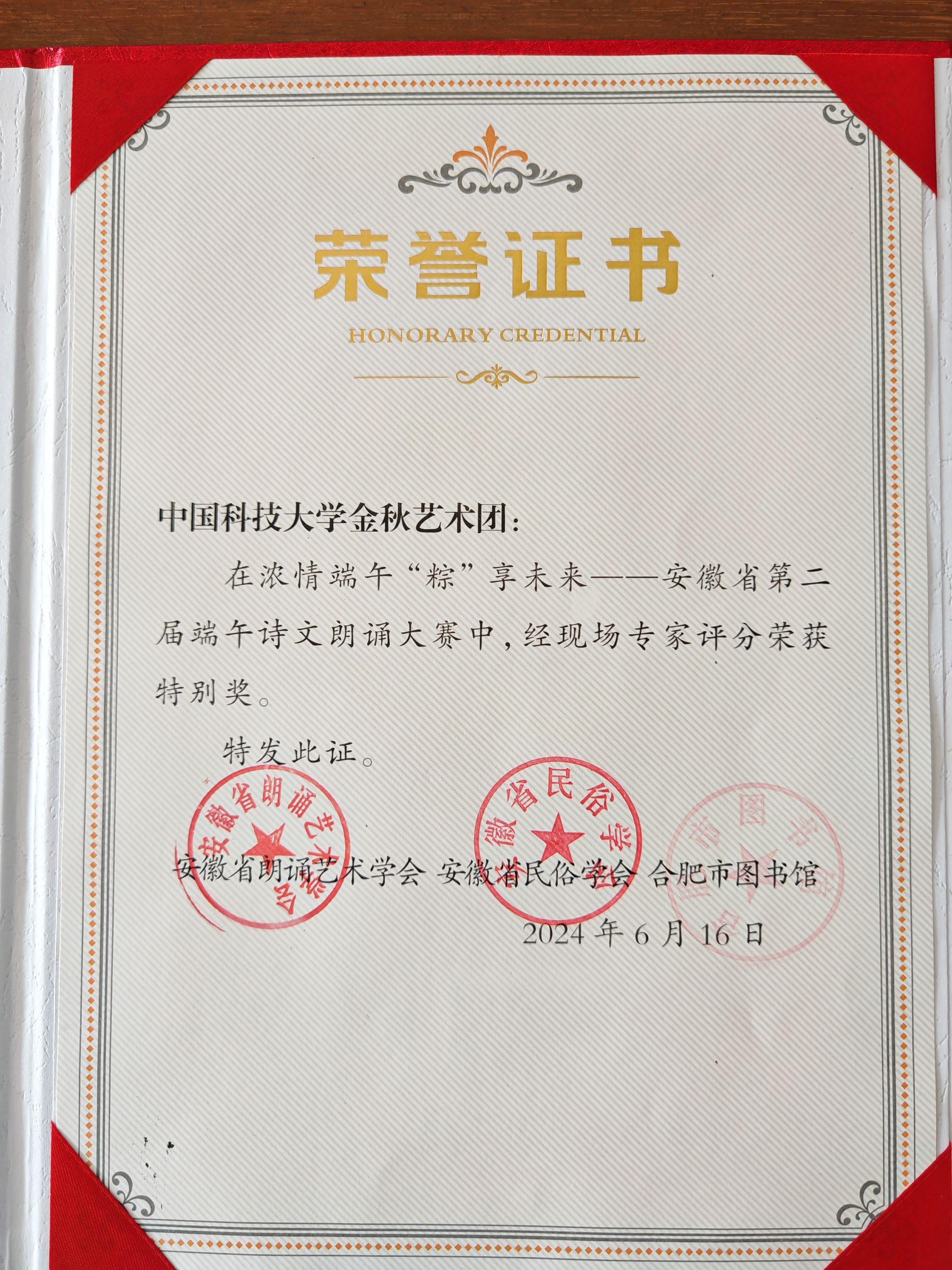 近日,我校金秋艺术团受邀参与安徽省、合肥市及学校多项演出,并荣获安徽省第二届端午诗文朗诵大赛特别奖。