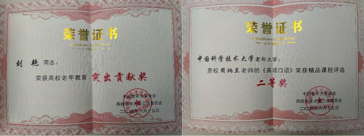 6月13-16日,中国老年大学协会高校工作委员会三届一次会议暨高校第三年龄大学联盟高工委二届一次会议在江西南昌召开。我校老年大学常务副校长刘艳同志荣获老年教育突出贡献奖,我校老年大学《英语口语》课程荣获中国老年大学协会高校工作委员会精品课程二等奖。