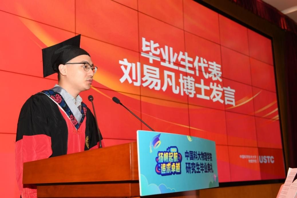 2024届研究生代表、光学与光学工程系博士毕业生刘易凡同学发言。他首先代表物理学院2024届全体毕业生,向母校、向所有默默奉献、呕心沥血的老师们、向一路陪伴的家人朋友们表达感激与敬意。刘易凡同学回顾了在科大的快乐与失落、成就与煎熬,既感叹“不要命的上科大”,也感怀曾经坚持的自己。随后刘易凡同学表示,在之后的人生道路上,将不忘“红专并进,理实交融”的校训精神,传承“科教报国、追求卓越”的优良传统,承担国家、民族和社会赋予的责任,坚定地走向梦想,勇敢地追逐目标。