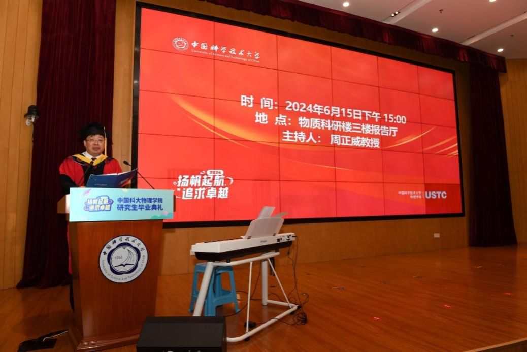 物理学院执行院长陈宇翱在致辞中表示,同学们在科大度过了一段人生中宝贵而难忘的时光,在学术的追求中磨练意志,在师友的陪伴中收获成长,用勤奋和汗水浇灌着梦想,用智慧和勇气攀登着科研高峰。