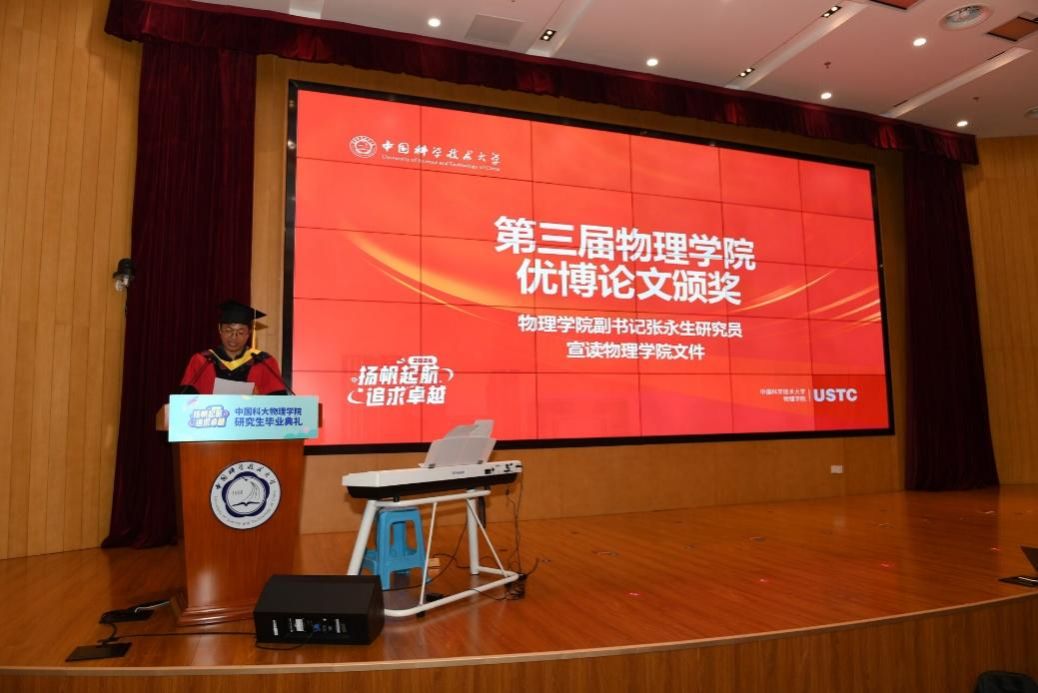 物理学院党委副书记张永生研究员宣读了2024年度物理学院优秀博士论文获得者名单,并向他们表示祝贺,邓宇皓等12位同学的博士学位论文获得该殊荣,陈宇翱、周正威为获奖同学颁发了物理学院优秀博士学位论文证书。