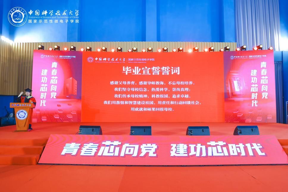 2020级本科生尹浩然、2019级研究生余华斌分别代表毕业生发言。尹浩然表示,在中国科大的时光里,“学会了”很多,在忙碌中寻求快乐、在生活中贯彻所学、在数理中坚守情怀、在祖国需要时挺身而出,勉励同学们作为新一代集成电路人,传承科大精神,勇担报国使命,积极为国家集成电路事业贡献科大“芯”智慧。余华斌表示,中国科大从诞生之日起就肩负着科教报国的使命,国家示范性微电子学院更是新时代积极响应国家号召、服务国家战略、解决集成电路产业“卡脖子”难题而成立,希望同学们传承红色基因、勇担时代使命,积极投身“中国芯”自立自强的伟大征程中去。