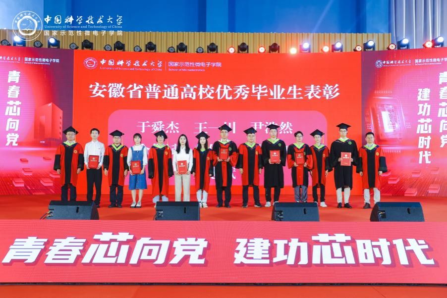 博学而笃志,切问而近思。朱云浩宣读微电子学院2024届中国科学院院长奖名单、安徽省优秀毕业生名单和毕业生优秀共产党员名单,嘉宾们共同为15位获奖者颁奖。微电子学院像一座青春驿站,同学们在这里收获了学业上、生活中的喜悦和成功,努力成长为德智体美劳全面发展的“六有”大学生。