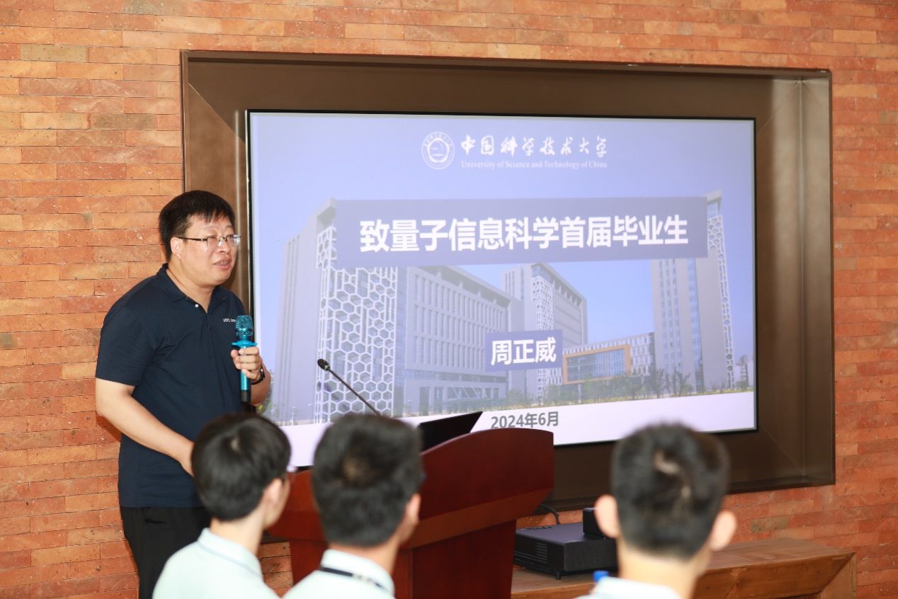 陈宇翱首先向毕业生们表达了热烈的祝贺,他将自己的科研经历娓娓道来,向同学们分享了科研道路上遇到的挫折和克服困难的经验感受。他表示,当前,量子科学与技术的研究已经被我国和国际上的主要发达国家提升到国家战略的高度,同学们作为我国首批量子信息科学专业本科毕业生,抓住机遇,不负韶华,顺利完成学业并实现百分百继续深造。在未来,应努力担当起时代赋予的使命与责任,为我国量子信息科学的发展贡献自己的力量。