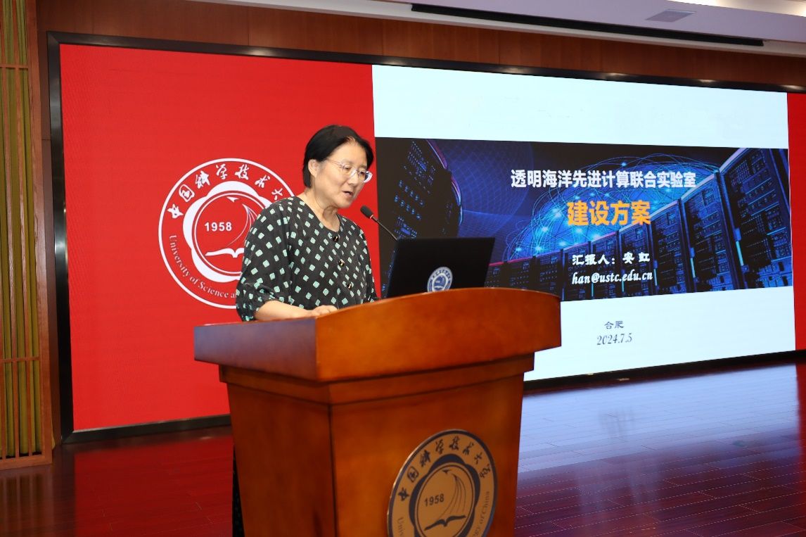 联合实验室主任、崂山实验室“卓越科学家”、中国科大计算机学院安虹教授向与会人员汇报了联合实验室建设方案。她介绍说,在科学研究方面,联合实验室将聚焦崂山实验室的使命任务和先进计算科学前沿,持续推进国产超算系统应用支撑环境和软件生态建设,以崂山实验室的重大使命任务为牵引,大力开展前瞻性、战略性、系统性研究,为实现崂山实验室的“透明海洋”战略提供先进计算技术支撑。在团队建设和人才培养方面,联合实验室将传承中国科大“红专并进、理实交融”的校训,组建高性能计算交叉学科导师团队,共同开设研究生前沿交叉课程,联合培养精通使用高性能计算、人工智能和大数据分析融合计算技术和海洋数字孪生技术的交叉复合型人才。
