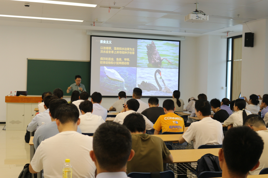 在黑天鹅“安家”高新园区三个月之际,为进一步推进美丽园区、文明园区建设,丰富提升园区生态环境,提升师生保护天鹅、爱护生态的意识和专业知识,7月19日下午,高新园区建设与管理委员会办公室邀请生命科学与医学部、生命科学学院副教授李旭老师在园区图书教育中心A401教室,为师生作黑天鹅相关知识的科普讲座。高新园区建设与管理委员会办公室副主任何昊华、图书馆副馆长樊亚芳以及80余位感兴趣的师生参加了讲座。