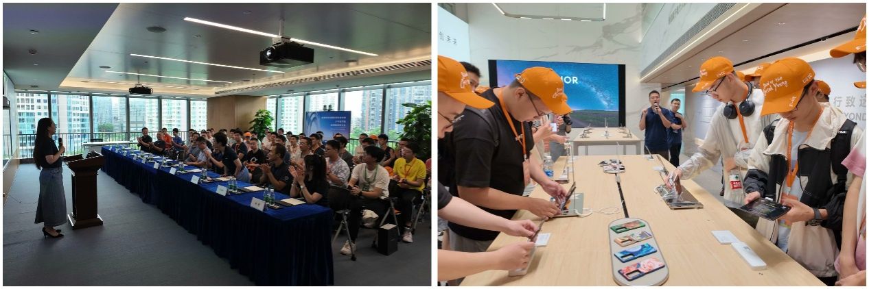 在荣耀,同学们参观了产品展厅和坪山智能工厂,并与荣耀研发管理部高级副总裁肖军和在荣耀工作的校友专家欧阳月辉、姚亮亮和许璨座谈交流,激发对科技与创新的无限热情,加深对智能制造的直观认识和对职业规划的思考。