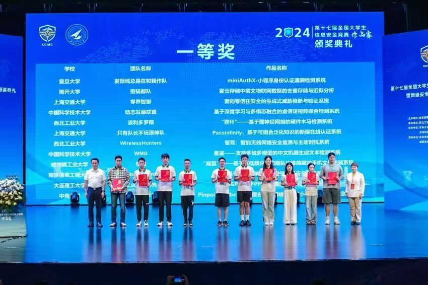 8月14日,由教育部高等学校网络空间安全专业教学指导委员会主办,西北工业大学承办的第十七届全国大学生信息安全竞赛——作品赛决赛在西北工业大学太仓智慧港校区圆满结束。此次大赛共收到全国229所高校、3598名大学生提交的1023个作品,其中来自117所高校的359支队伍进入决赛。中国科学技术大学网络空间安全学院共有5支队伍进入决赛,取得了2项一等奖、2项二等奖,1项三等奖的优异成绩。大赛从48个一等奖项目中评选出12项“最具创新创业价值奖”,我校2个一等奖项目均入选。这是我校学生首次获得“最具创新创业价值奖”殊荣,表明我校学生的作品,在创新性和商业价值方面,得到有商业投资人和企业专家参加的评审专家组的高度认可