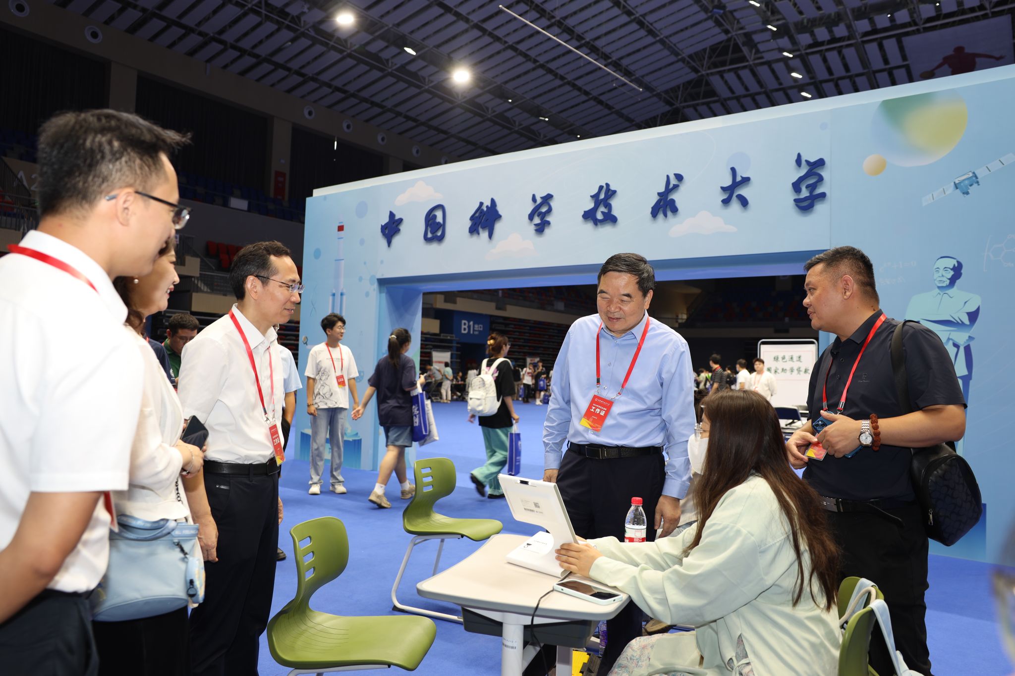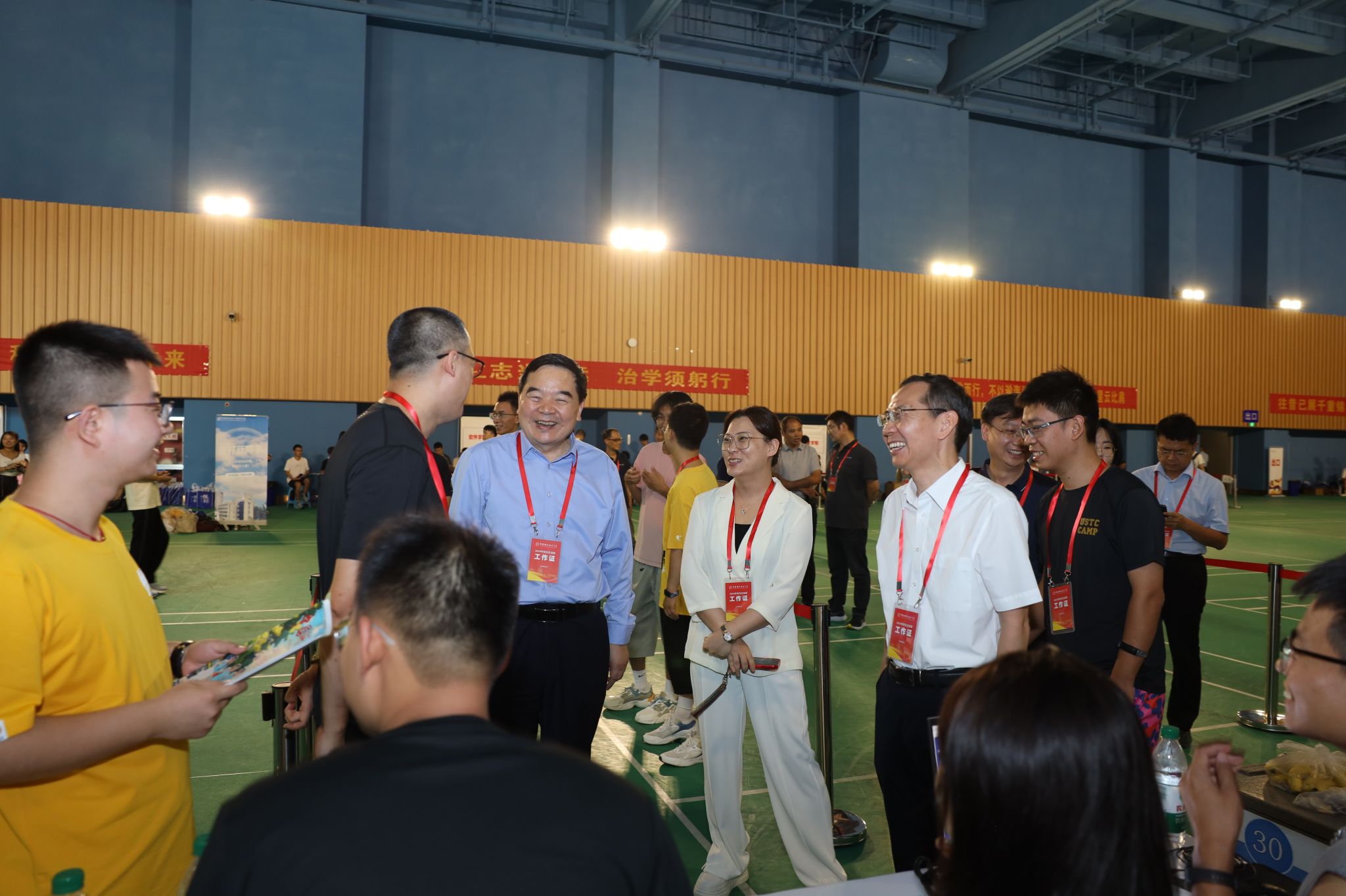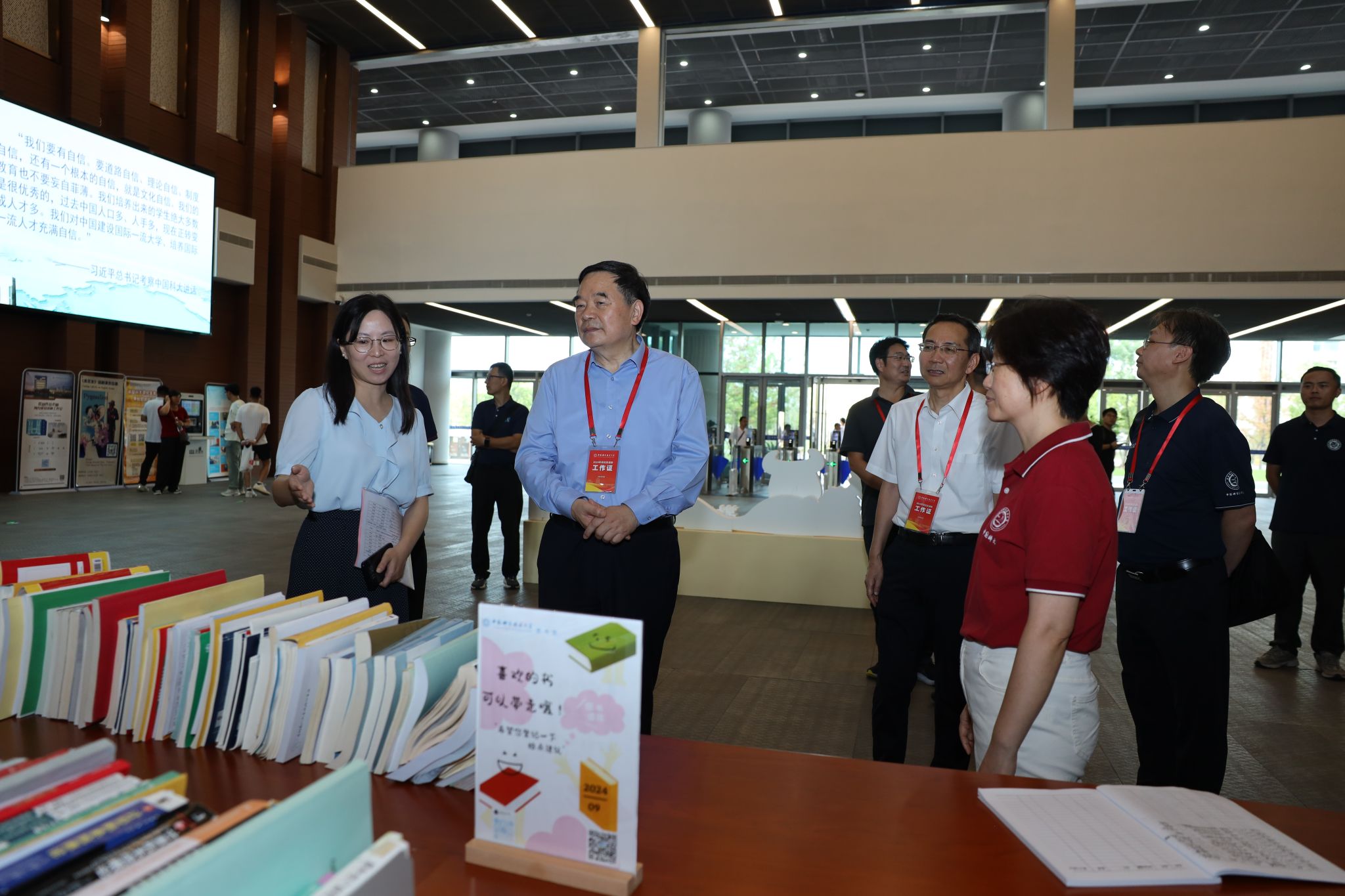 随后,包信和一行考察了高新园区图书馆迎新活动,图书馆一楼展出了“图书漂流”活动的书籍,这些图书来自于毕业季师生捐赠,在迎新季,学生可以根据需求领走心仪的图书。
