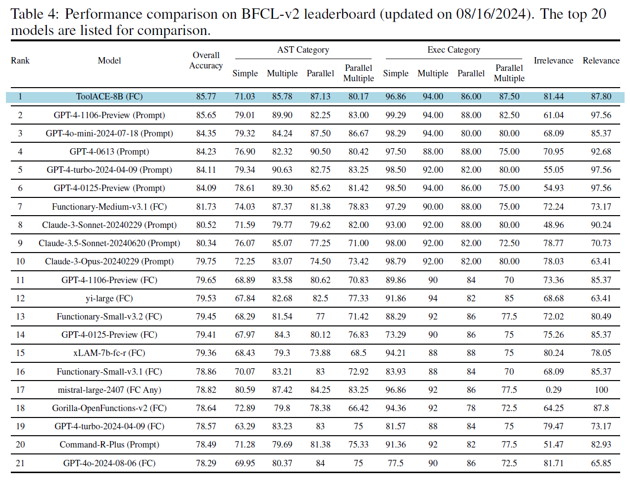 近日,我校计算机科学与技术学院、认知智能全国重点实验室陈恩红教授团队联合华为等单位发布了新的工具调用模型ToolACE,在开源工具调用榜单BFCL(美国伯克利大学发布的函数调用榜单)中效果持平千亿参数量级别模型GPT4,获得开源模型的第一名。