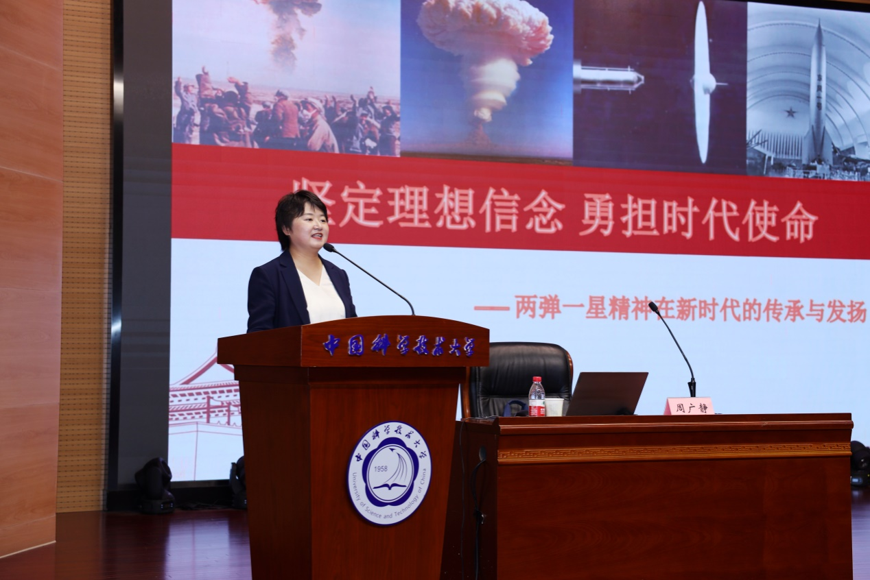 今年是中国第一颗原子弹成功爆炸60周年,是新中国成立75周年,也中国科学技术大学建校66周年。为大力弘扬“两弹一星”精神,厚植爱国情怀,9月20日校庆日下午,党委教师工作部、人力资源部特别邀请青海两弹一星干部学院教研部部长周广静老师来校宣讲。校党委副书记邓建松、青海两弹一星干部学院副院长李恒及考察团成员、有关部门负责人出席活动。党委教师工作部、人力资源部部长陈卫东主持活动。