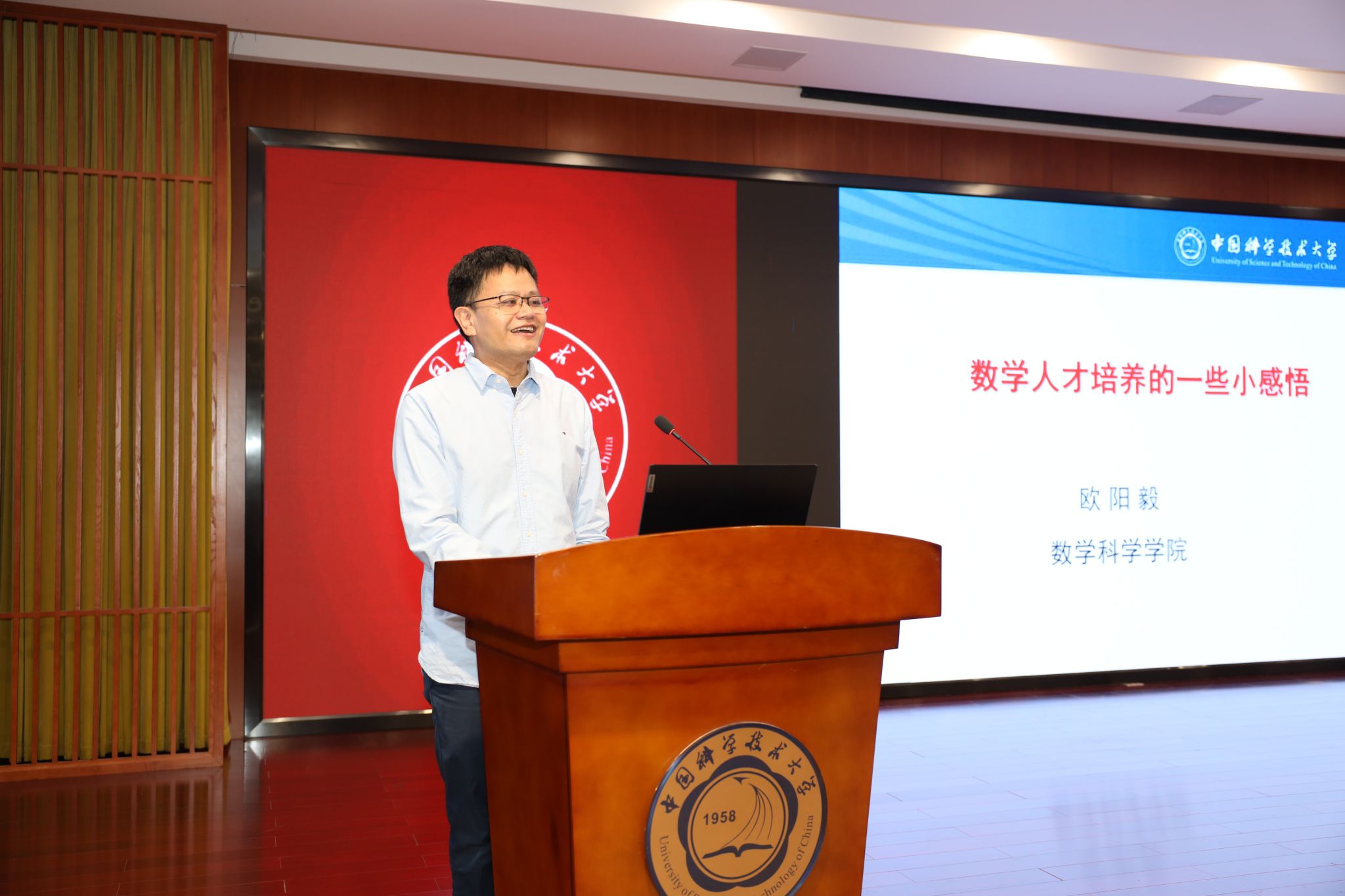 欧阳毅作题为《数学人才培养的一些小感悟》的报告。他从自身学习教育经历引入,阐释了与科大共进成长的人生选择。踏实做事,行胜于言,身为教育工作者要目标高远、视野宽广、基础扎实,从细处实处做起,用心用情指导培养学生,不抛弃、不放弃每一个学生,在科研教学实际中传承弘扬践行教育家精神。