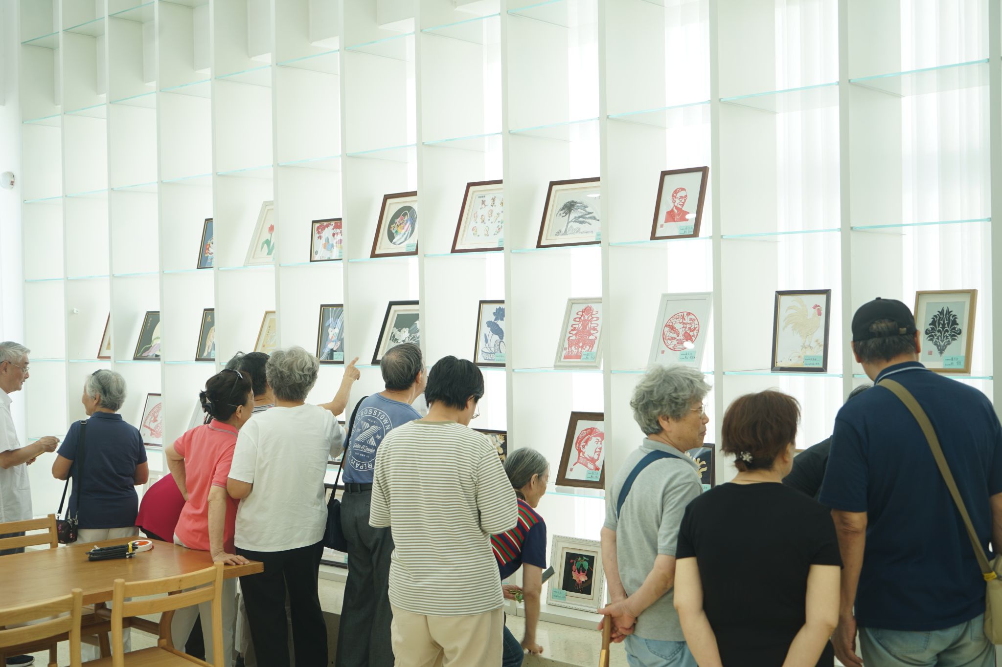 开展仪式后,参展领导与老同志们在南区图书馆一楼大厅驻足观看展品。本次展览分为书法、绘画、摄影和手工四个版块,共展出作品174件。参展作品饱含着老同志们对党、对国家、对学校的深情厚谊,蕴含着他们对生活的美好憧憬和期待,彰显了“离岗不离党、退休不褪色”的高尚情怀。作品展从今年5月启动,历经作品征集、筹备布展等阶段,在老年大学教师和学员们的热情参与和共同努力下,各项工作得以顺利进行。此外,本次活动得到本科生院的大力支持,当日下午,部分手工作品在中区艺术中心三楼正式开展。