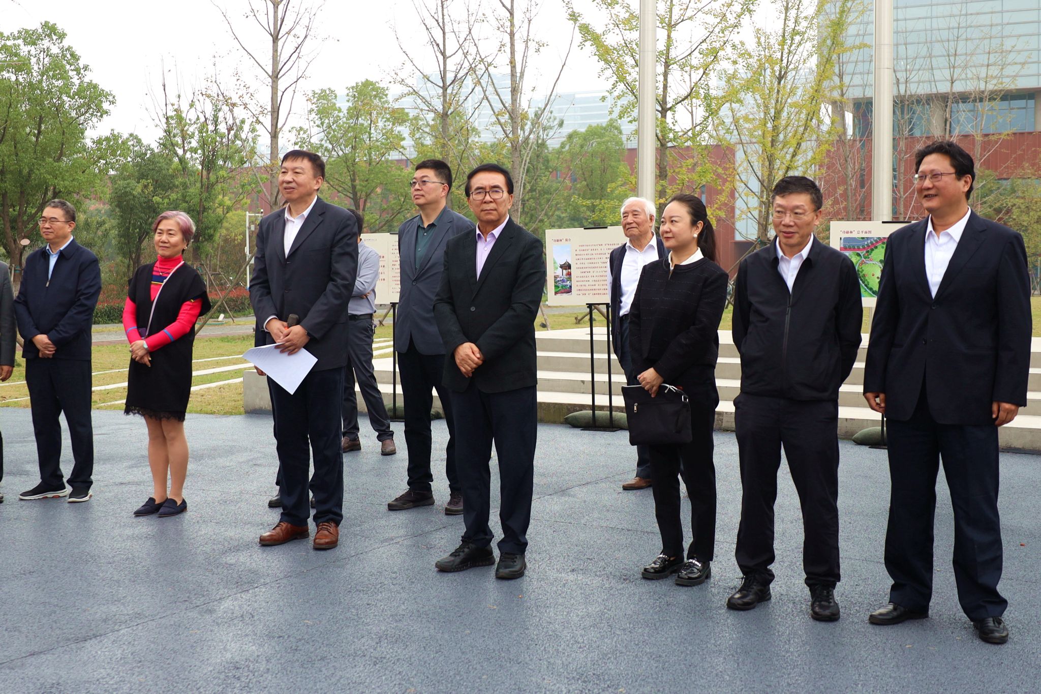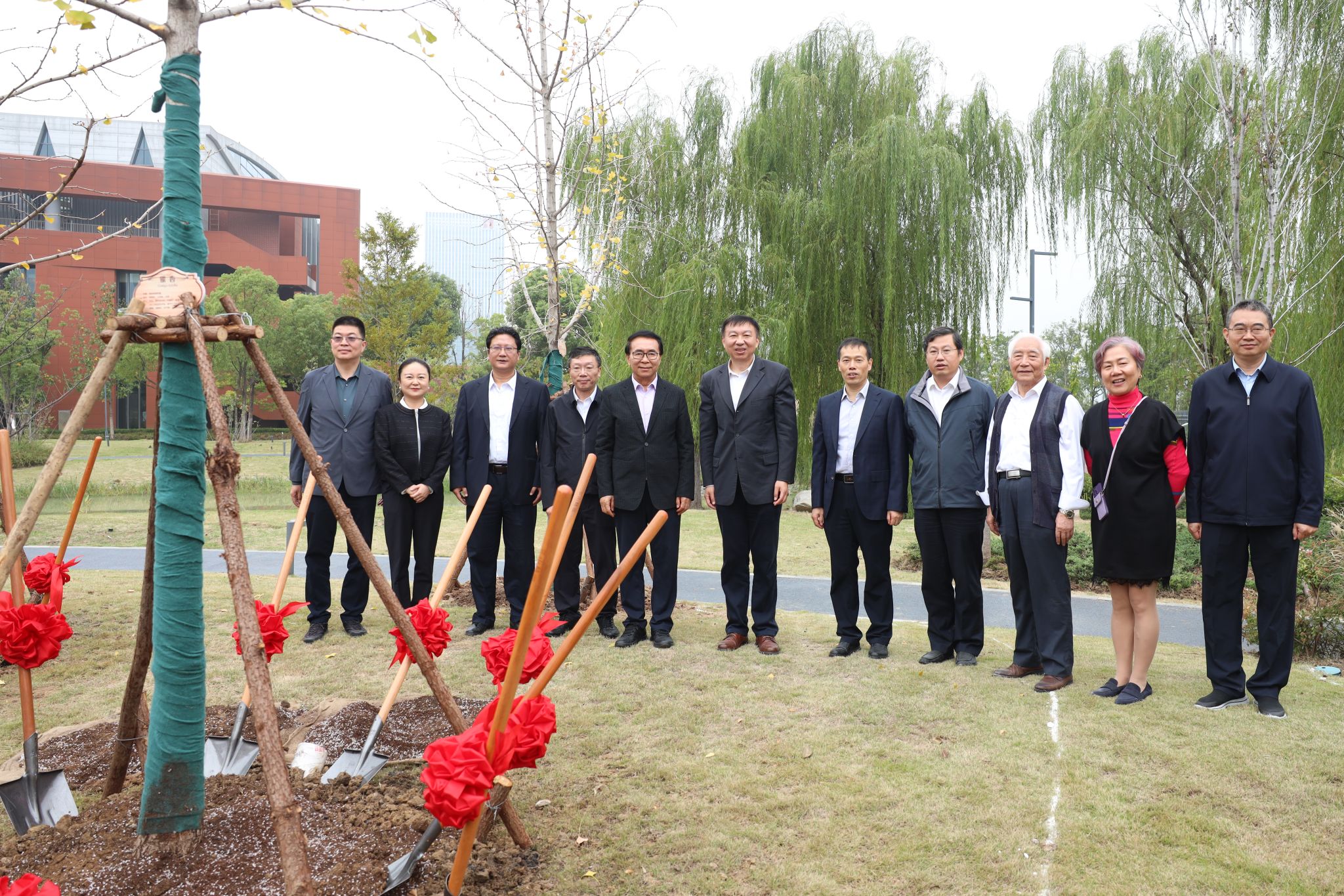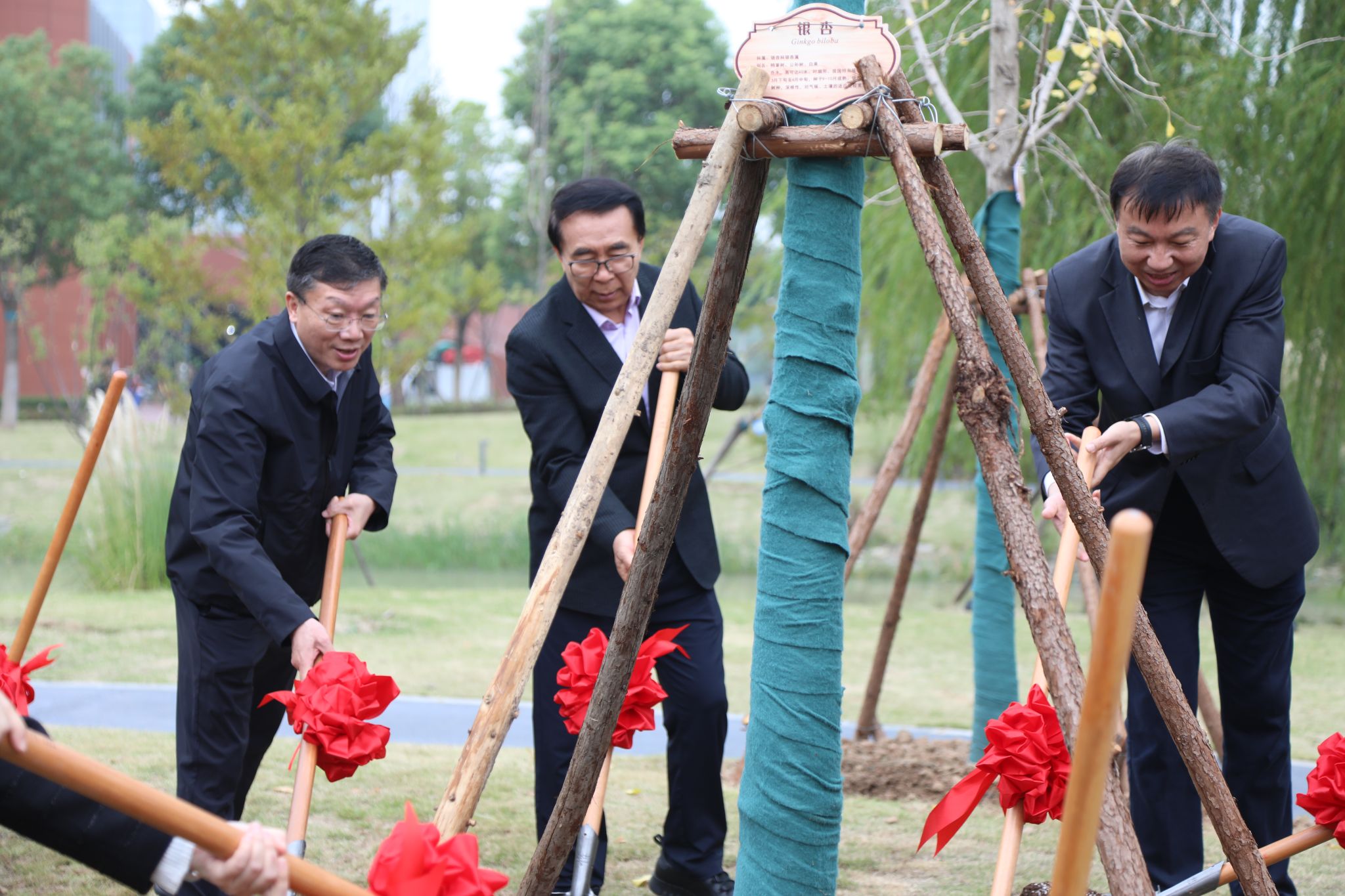 在“功勋林”植树区,校领导与嘉宾共同培土并种下树苗。
