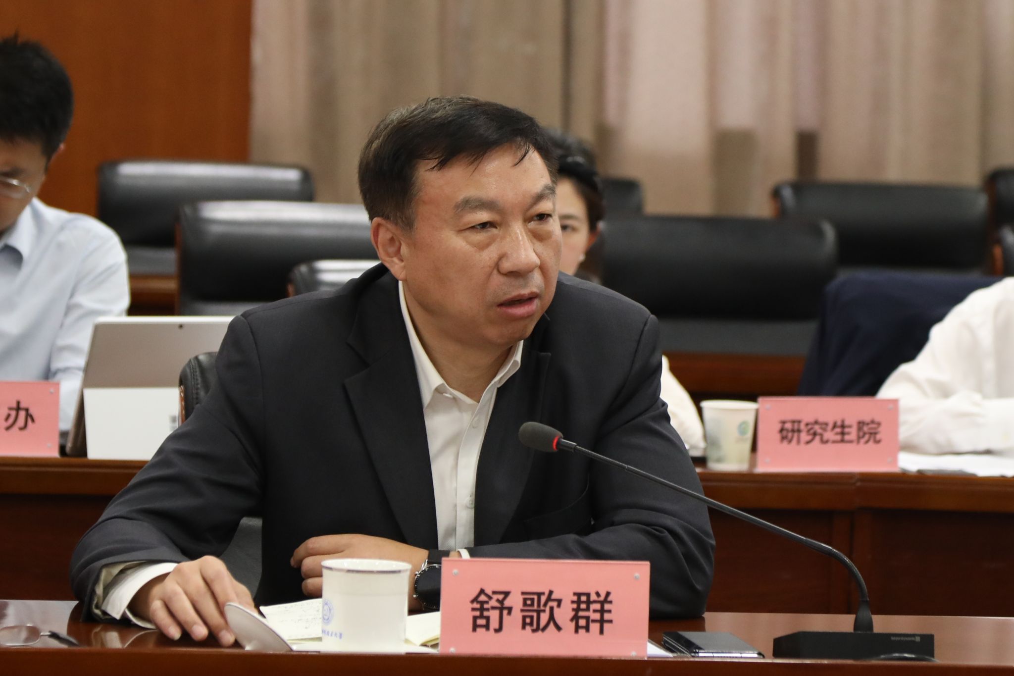 舒歌群针对当前学生工作面临的难点和挑战进行深入分析,强调学生工作队伍作为学生思想政治教育工作的骨干力量,要全面贯彻党的教育方针,落实立德树人根本任务。他就进一步做好学生工作提出三点希望:一是加强思政引领,坚持用习近平新时代中国特色社会主义思想铸魂育人,引导学生准确把握时代脉搏,厚植爱党爱国情怀;二是坚持“第一课堂”与“第二课堂”互促互进,将知识教育与思政教育有机结合,着力培养德智体美劳全面发展的社会主义建设者和接班人;三是强化管理服务,不断提升自身的理论水平、业务能力和育人本领,凝心聚力推动学校学生工作高质量发展。