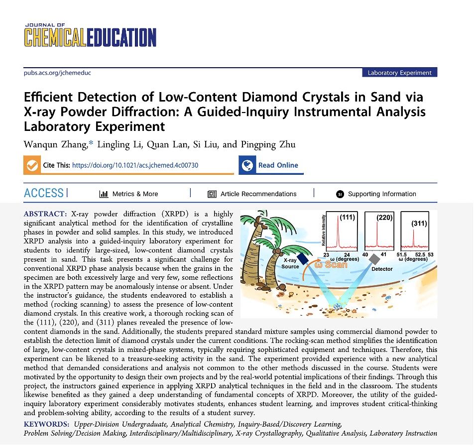 近日,我校化学与材料科学学院化学实验教学中心教师在美国化学会旗下的Journal of Chemical Education(JCE)发表了题为“Efficient Detection of Low-Content Diamond Crystals in Sand via X?ray Powder Diffraction: A Guided-Inquiry Instrumental Analysis Laboratory Experiment”的重要教学研究成果。这是我校第二次在该期刊发表教育研究论文。JCE创刊于1924年,是全球化学教育领域的顶尖SCI期刊。