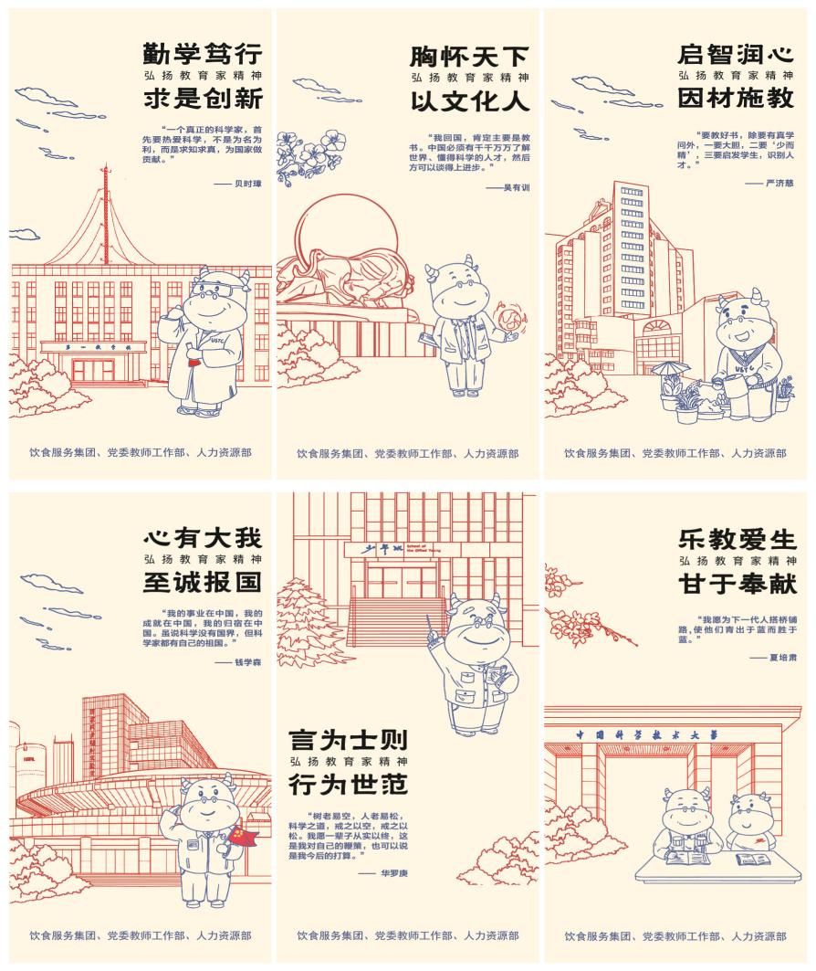 在校风传承月期间,饮食服务集团联合党委教师工作部、人力资源部,利用食堂台卡宣传阵地,厚植尊师重教文化,弘扬了教育家精神。台卡上绘有“孺子牛”卡通简笔画和老一辈科学家语录,诠释了习近平总书记提出的中国特有的教育家精神:“心有大我、至诚报国的理想信念,言为士则、行为世范的道德情操,启智润心、因材施教的育人智慧,勤学笃行、求是创新的躬耕态度,乐教爱生、甘于奉献的仁爱之心,胸怀天下、以文化人的弘道追求。”