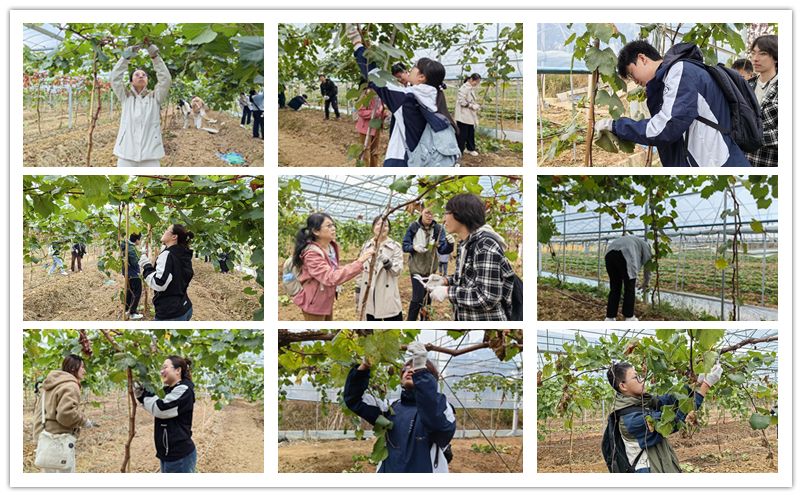 在专业人员指导下,同学们学习了葡萄侧枝初次修剪的原理和技巧。沿着葡萄植株的主干自下而上,依次剪除多余的侧芽,一直修剪到顶端T形或者Y形分枝处。专业人员还告诉同学们,待冬季全部葡萄叶落之后会进行二次修剪,确保所有的养分能够供应给主枝,从而提高来年葡萄的产量和品质。在示范性教学之后,同学们纷纷戴上手套,拿起剪刀,开始对大棚内的葡萄枝逐个进行细致的修剪,遇到问题时也会及时请教专业人员来实地指导。经过约两个小时的劳动实践,同学们不仅掌握了这一项实用的农业技能,更深刻体会到了劳动的乐趣和艰辛。