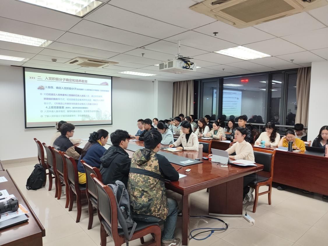 党务秘书邓丹从发展党员工作流程、学习宣传思想文化有关精神、讲解新闻写作与摄影技巧三个方面,带领同学们详细了解发展党员工作流程的五个阶段、25个步骤的相关工作及其注意事项,学习了习近平文化思想,强调了“七个着力”的重大意义。她结合自身学习工作经验,讲解了撰写新闻稿的基本步骤与常见问题、会议类与活动类场景的新闻图片拍摄技巧。