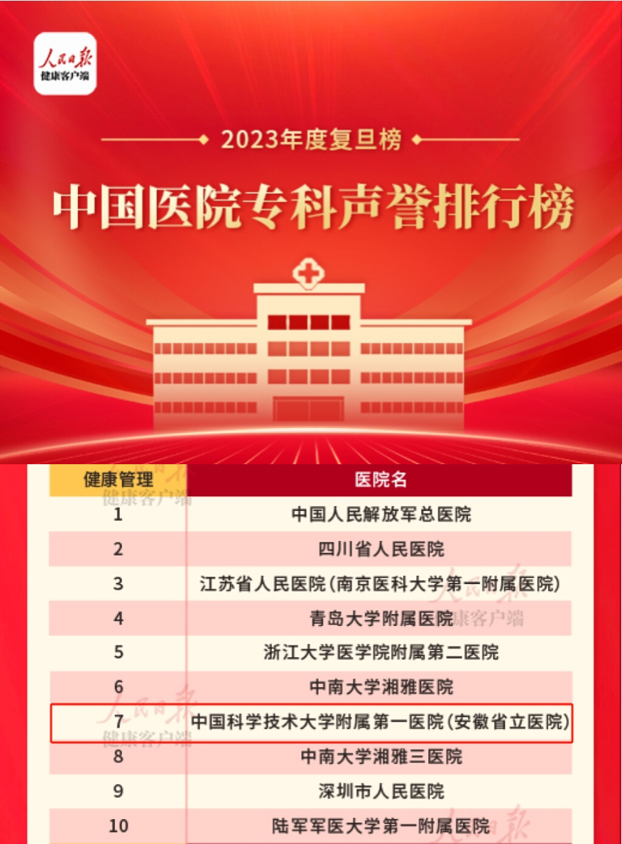 在中国医院专科声誉排名中,健康管理中心排名第7位,普外科、风湿免疫科、检验科、临床病理中心、小儿外科、耳鼻咽喉头颈外科、康复医学科、运动医学科获得全国提名。医院是进榜和提名学科数量最多的安徽医院。