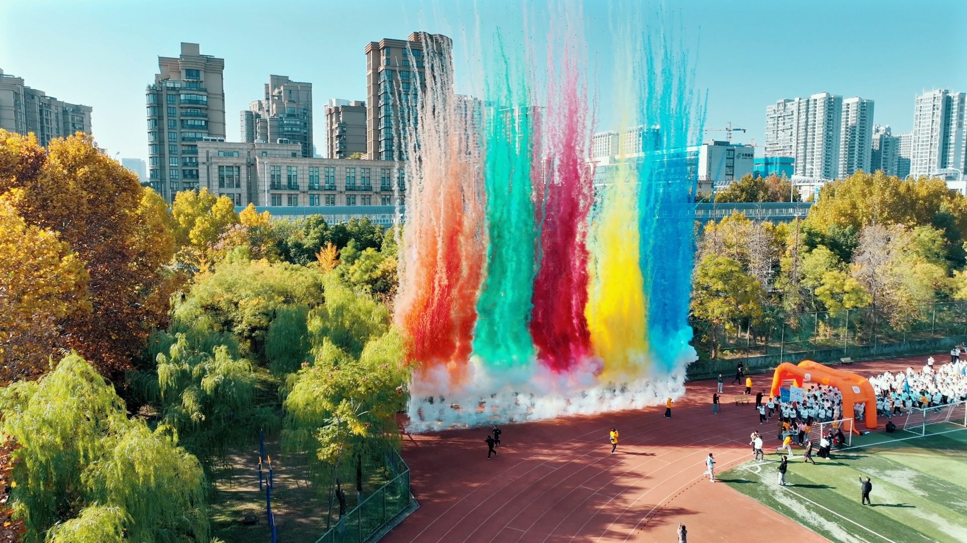 与此同时,最受期待的“彩虹狂欢”也在操场正中央分批进行,现场师生手持彩粉袋,纷纷进入“狂欢区”场地,场地上充满着欢笑声、呐喊声,大家用彩粉释放压力,互相泼洒、涂抹,整个操场瞬间变成了一个五彩斑斓的欢乐海洋,周围的空气中弥漫着彩粉,就像是被带入了一个色彩的世界,五彩的粉末在空中飘扬,形成一道道美丽的彩虹。