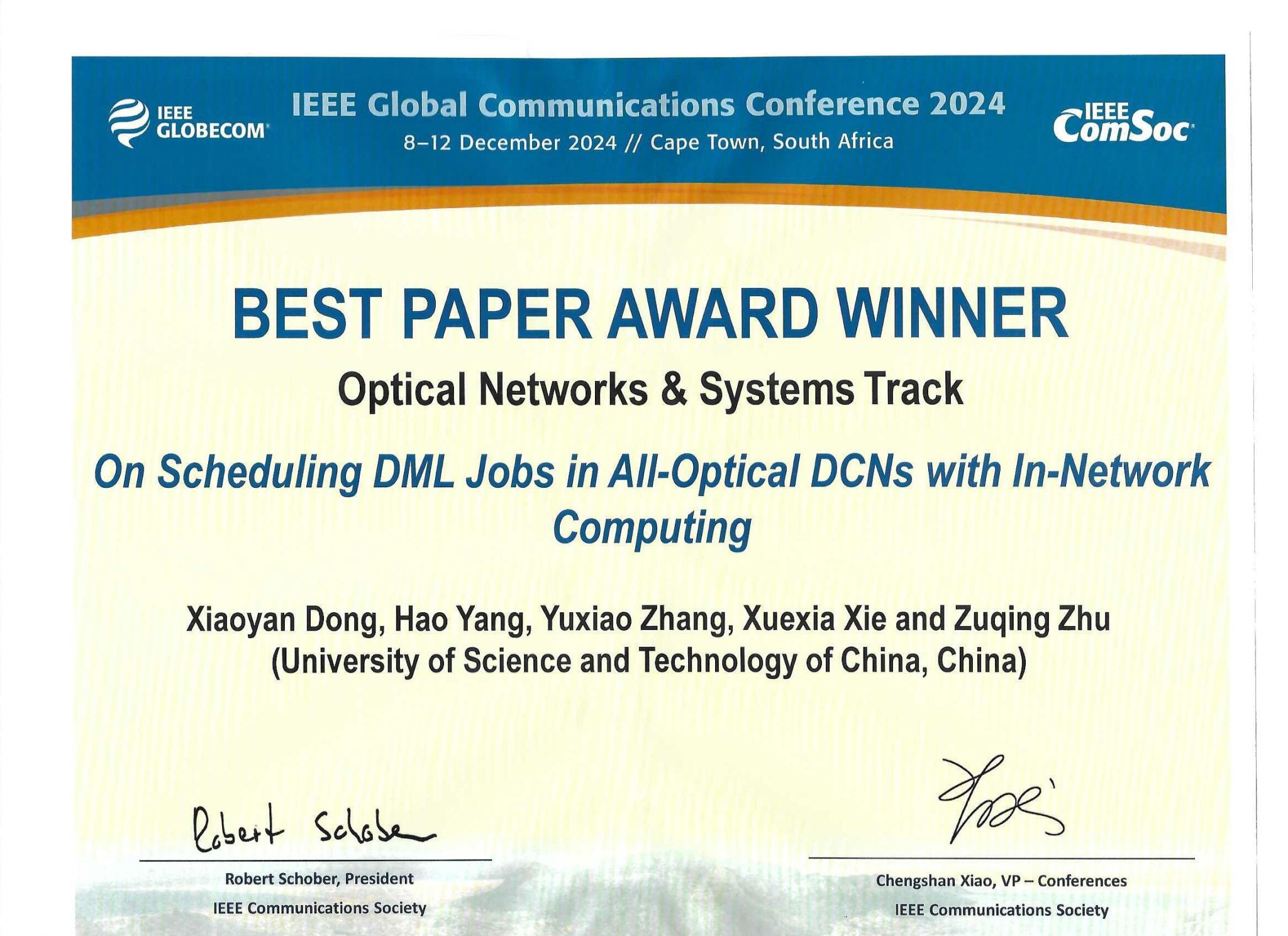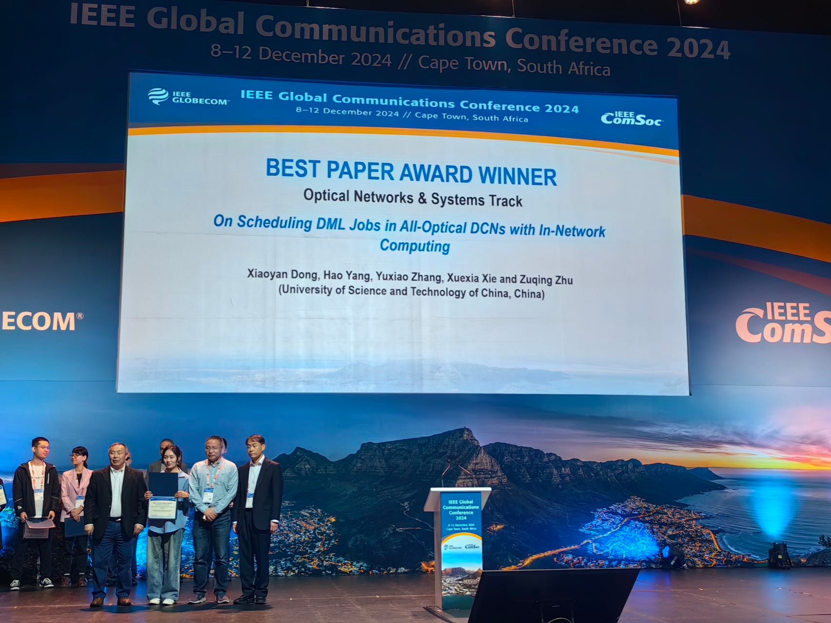 12月11日,在南非开普敦召开的IEEE Global Conference on Communications(IEEE GLOBECOM 2024)会议上,我校信息科学技术学院朱祖勍教授团队的题为《(关于在全光数据中心中利用在网计算技术调度分布式机器学习业务)On Scheduling DML Jobs in All-Optical DCNs with In-Network Computing》的论文获得了大会颁发的最佳论文奖(Best Paper Award)。该文的第一作者董晓燕为我校信息科学技术学院的硕士生,其导师朱祖勍为通讯作者,中国科大是文章的唯一单位。该论文创新性地提出在数据中心中利用在网计算技术与全光互联结构的互利性加速大语言模型的分布式机器学习训练,设计了全新的网络架构和高效的调度算法,并用大量仿真从多个方面验证了所提方案的优越性。