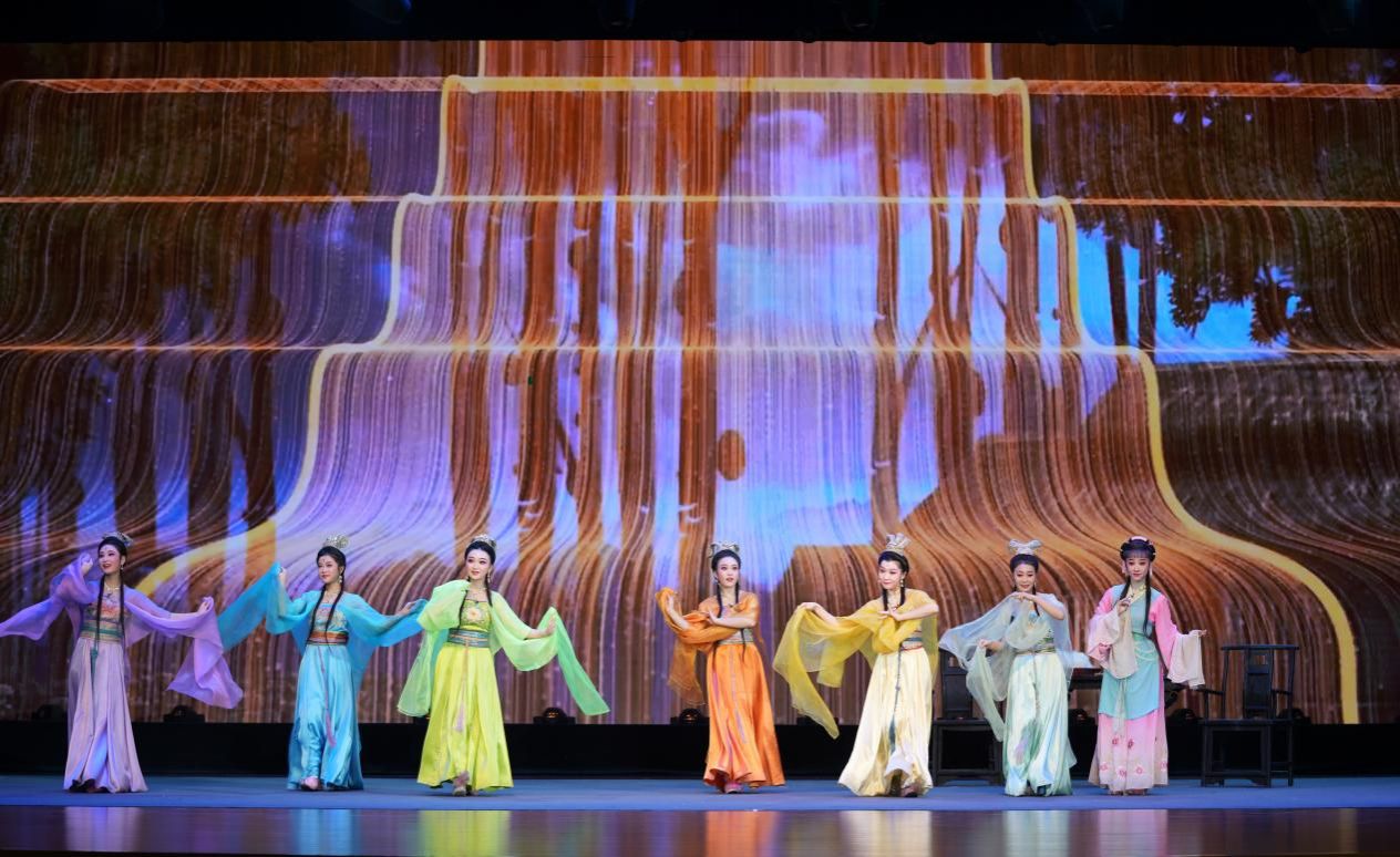 “姐妹七人鹊桥上,要把人间看一番。”在《鹊桥》一折,七位仙女身着各色长裙,伴着灵动的音乐、浪漫的背景,用优美的身段载歌载舞,将观众带入了如梦似幻的仙境。随着仙女们对人间“渔樵耕读”的赞美,比天庭更广阔繁荣的人间图景徐徐展开,饱含着古人对劳动人民的赞美,体现出黄梅戏热爱生活的正能量。“神仙岁月我不爱,人间景色胜瑶台。”七仙女放弃了神仙的身份,在《路遇》一折亲手促成与董永的姻缘,土地主婚、槐荫为媒,结为夫妻,更显得这段感情弥足珍贵。七仙女的主动大方、董永的淳朴善良,令在场的观众忍俊不禁。“上无片瓦我不怪你,下无寸土我自己情愿的。”朴实的语言唱出了爱情最美好的样子。